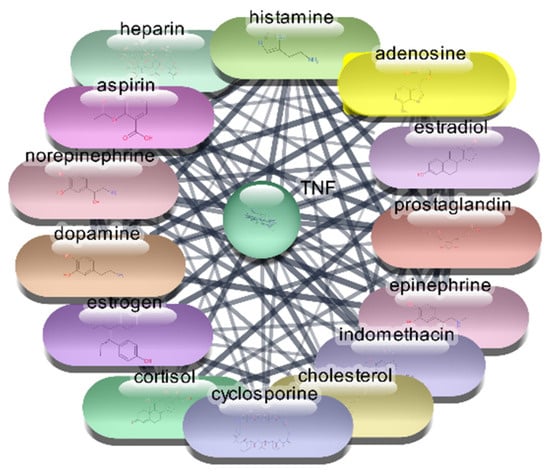 The analysis of the top 10 FDA-approved drugs interacting with TNF-α reveals significant insights into their potential therapeutic efficacy. Cholesterol stands out with the highest degree centrality of 53, indicating the most direct interactions within the network. Its high betweenness centrality of 409.4760674 and closeness centrality of 0.666666667 underscore its critical role in network connectivity and efficiency. Aspirin, with a degree centrality of 45 and a notable betweenness centrality of 276.6920675, also shows strong connectivity and influence. Norepinephrine (degree 43), epinephrine (degree 41), and histamine (degree 40) demonstrate substantial network presence, reflected by their high betweenness and closeness centrality scores, suggesting their potential as effective TNF-α inhibitors. Estrogen, cyclosporine, prostaglandin, heparin, and dopamine, with degree centralities ranging from 39 to 37, further contribute to the network’s robustness, each playing a pivotal role in facilitating interactions and ensuring efficient communication within the network which is shown Table 5 and Figure 8. These centrality metrics collectively highlight the potential of these drugs in targeting TNF-α, providing a strong foundation for further research and drug repurposing efforts aimed at treating conditions mediated by TNF-α.