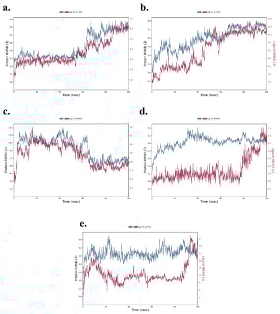 To assess the stability and behavior of the protein–ligand complexes, we, as part of our research team, employed MD simulations, a powerful tool for studying the dynamic interactions between ligands and their target proteins. The stability of these complexes is crucial for understanding how potential inhibitors might block receptor activity. MD simulations provide insights into the conformational landscape of protein–ligand complexes at a specific temperature, allowing us to observe the changes in the structure and dynamics of these complexes over time. Our team conducted the MD simulations to evaluate the stability, function, and binding free energy of the protein–ligand complexes formed during the molecular docking process. This approach is vital for predicting the effectiveness of small molecule inhibitors. By comparing the behavior of the five target-ligand complexes, we identified key differences that may influence the efficacy of these inhibitors in targeting RA. The simulation results provided valuable information about the binding stability of each complex, guiding us in prioritizing the most promising drug candidates for further experimental validation. The docked complexes, derived from PyRx docking studies, served as the starting point for the MD simulations. These simulations were performed using the Desmond module of the Schrodinger Suite 2021-4, employing the OPLS3e force field to ensure accurate modeling of molecular interactions. Water molecules were modeled using the TIP4P model and placed in an orthorhombic box, with a 10 Å buffer zone between the protein atoms and the box sides to explicitly solve the complexes. System minimization was performed using the OPLS3e force field, employing 200 steps of steepest descent followed by 1000 steps of the conjugate gradient method until a gradient threshold of 25 kcal/mol was reached. Short- and long-range electrostatic interactions were described using the smooth particle mesh Ewald (SPME) method, with a short-range cutoff of 9.0 Å and a long-range electrostatic tolerance of 1 × 10−9. Simulations were conducted under isothermal–isobaric conditions (NPT ensemble) at a temperature of 300 K and a pressure of 1 bar. To maintain stability, a Martyna–Tobias–Klein barostat and a Nose–Hoover thermostat was used. The simulations ran for 100 nanoseconds with a time step of 2 fs. The reversible reference system propagator algorithm (RESPA) was employed for integrating bonded, nonbonded, and near nonbonded interactions with varying time steps [39,41,47,48]. The MD simulation results serve as a crucial step in refining our drug repurposing strategy, allowing for the identification of the most stable and promising inhibitors for the treatment of RA.