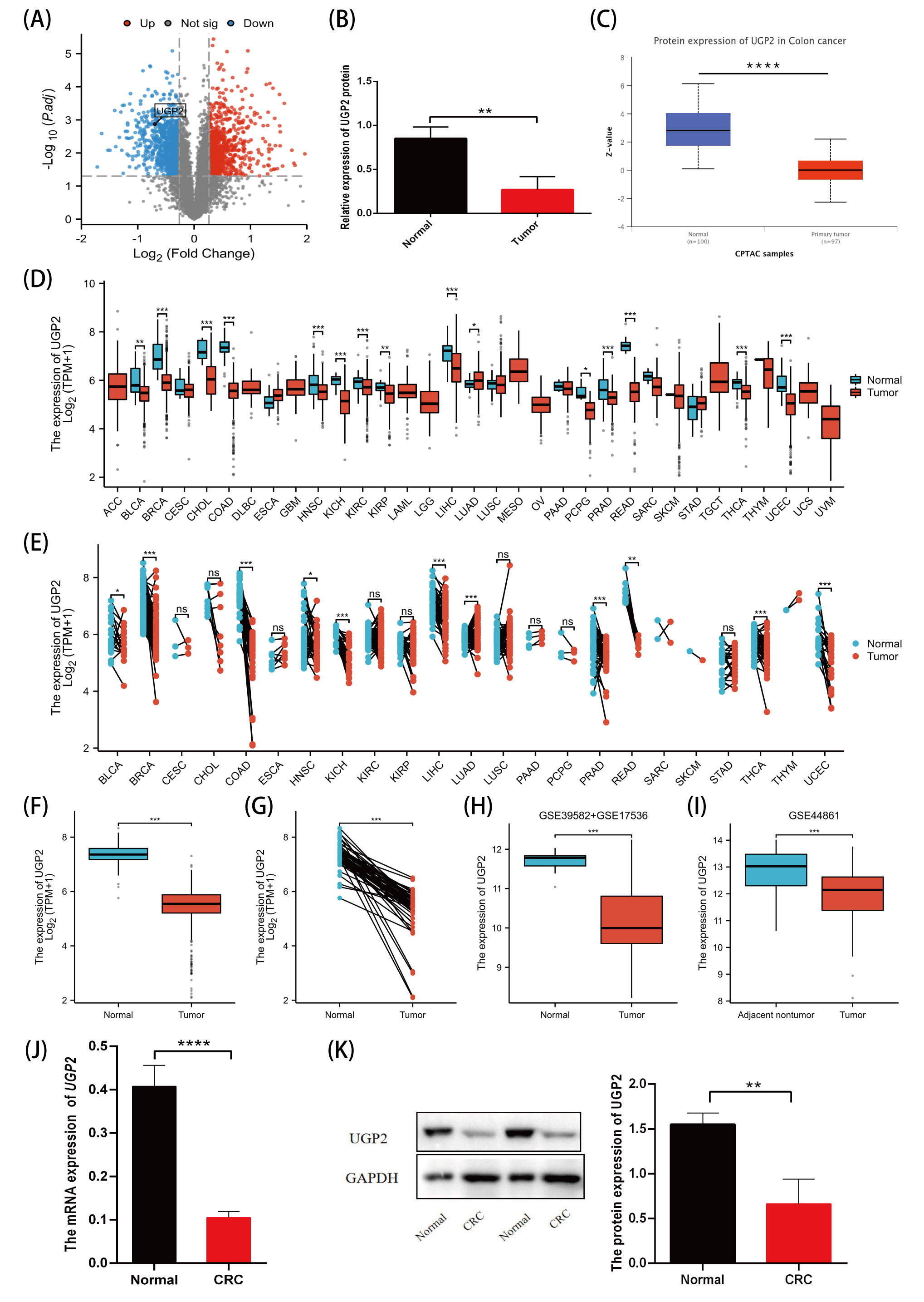 Our study revealed that UGP2 expression was significantly downregulated in CRC tissues compared with that in normal tissues. This was validated through PRM relative quantification analysis, data from the CPTAC database, qRT-PCR, and Western blotting. Additionally, analysis of the TCGA and GTEx databases demonstrated significant downregulation in 21 types of malignancies, including COAD and READ. UGP2 is aberrantly overexpressed and positively correlated with pathological grading in GBM in humans [