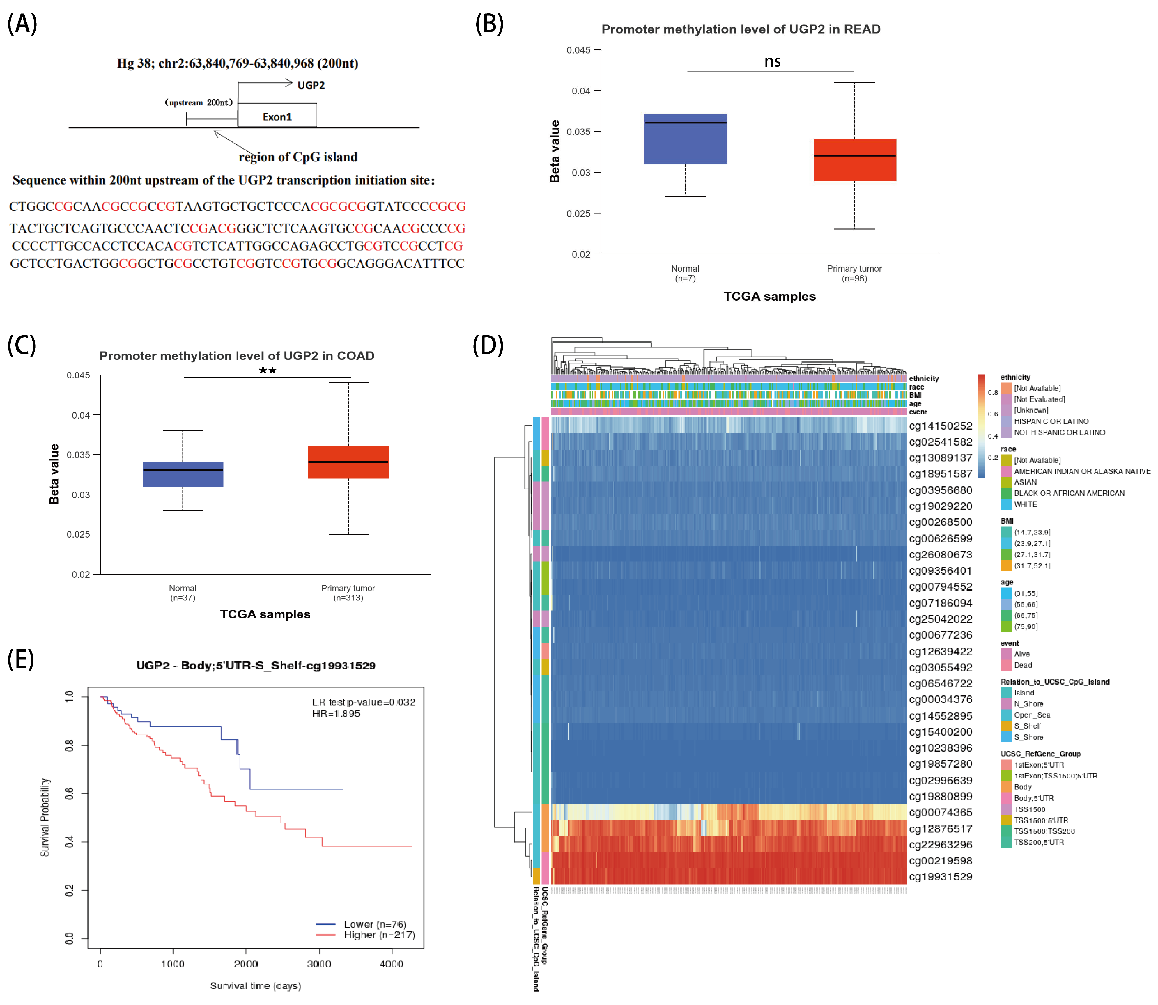 UGP2 promoter region was hypermethylated in COAD tissues compared with that in normal samples (
