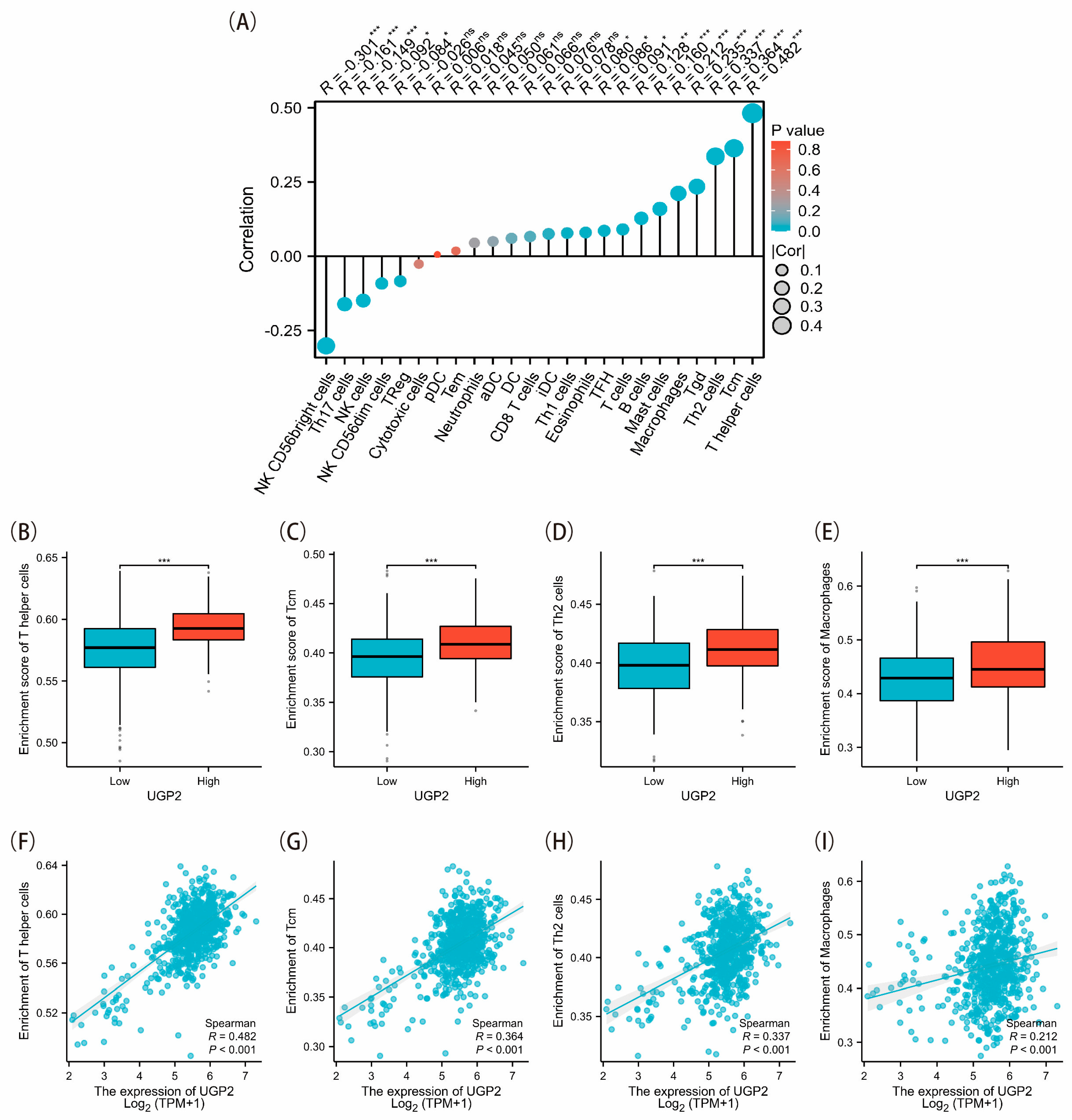12]. Spearman’s rank correlation was applied to analyze RNA-seq data obtained and processed from TCGA database, along with the associated clinical data. The thresholds for high and low UGP2 expression were determined based on the median values obtained from our cohort analysis. Enrichment scores were then calculated to explore the differences in the infiltration levels of 24 immune cell types between the UGP2 high and low expression groups.