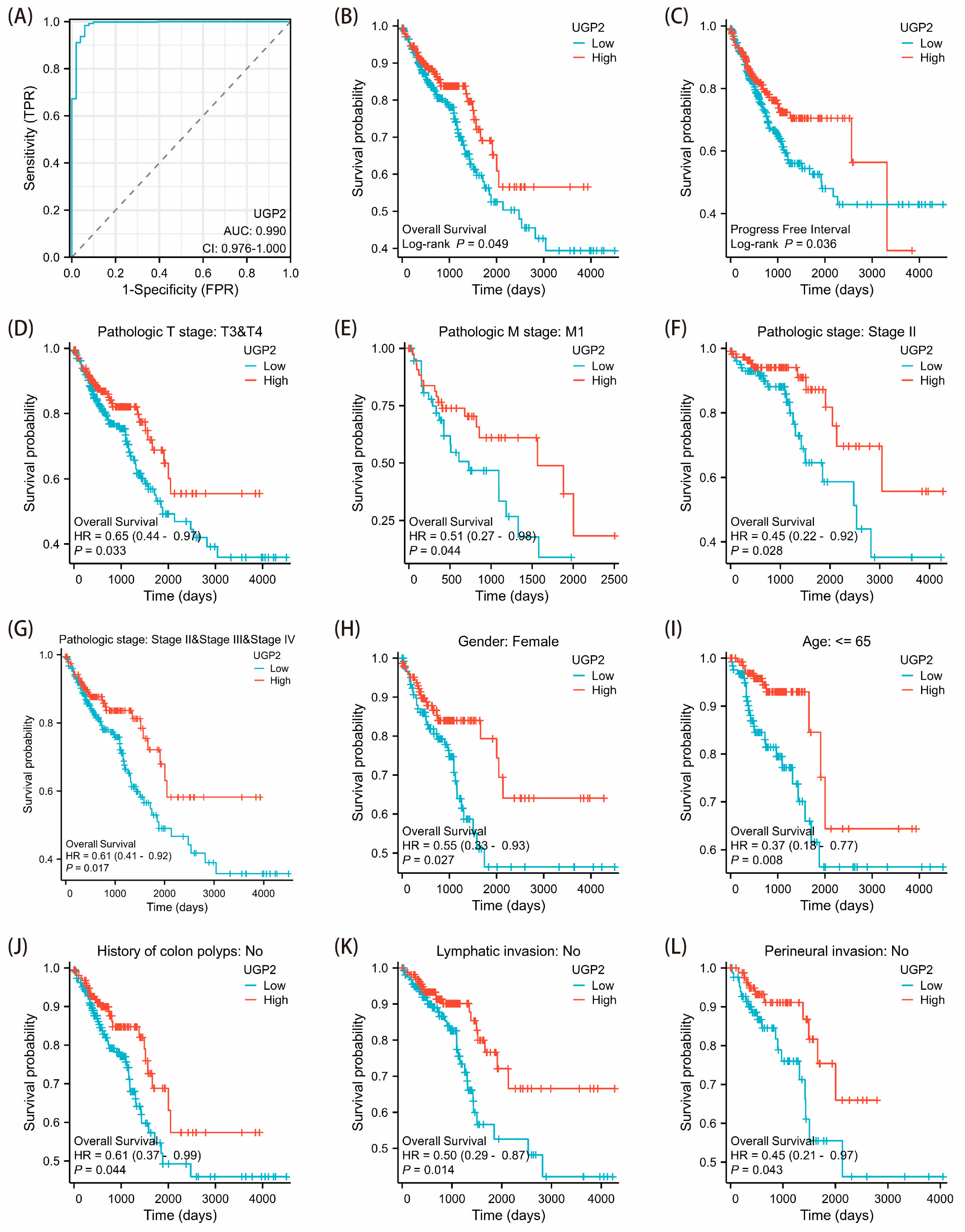 39]. Functionally, this may manifest as increased tumor cell proliferation and migration alongside reduced apoptosis. To confirm the clinical significance of UGP2 as a tumor suppressor gene in CRC, we first evaluated its diagnostic accuracy in identifying CRC. Subsequently, we analyzed the prognostic implications of UGP2 expression levels, including on OS, PFI, and survival rates, across various clinical subgroups. The ROC curve analysis demonstrated exceptionally high accuracy in distinguishing patients with CRC based on UGP2 expression, underscoring its value as a diagnostic marker. Furthermore, the KM curve analysis revealed that patients with low UGP2 expression exhibited poorer prognosis in terms of OS and PFI than those with high UGP2 expression. This was also evident across various clinical subgroups, including pathological T3 and T4 stages, pathological M1 stage, pathological stages II, III, and IV, female patients, those aged ≤ 65 years, and those with no history of colon polyps, no lymphatic invasion, and no perineural invasion. These results support the notion that UGP2 functions as a tumor suppressor in CRC and establish it as a potential prognostic marker. This could be used to stratify patients based on risk and guide the development of personalized treatment strategies. To further validate the function of UGP2 as a tumor suppressor gene on CRC at the cellular level, we conducted in vitro functional assays. Knockdown of UGP2 in HCT116 and SW480 cell lines enhanced cell proliferation and migration while reducing apoptosis; conversely, UGP2 overexpression reduced CRC cell proliferation and migration while enhancing apoptosis. This functional evidence reinforces the view that UGP2 is a tumor suppressor in CRC. Consequently, therapeutic approaches to restore UGP2 expression or function could inhibit CRC cell proliferation and migration, offering a promising strategy for combating CRC.