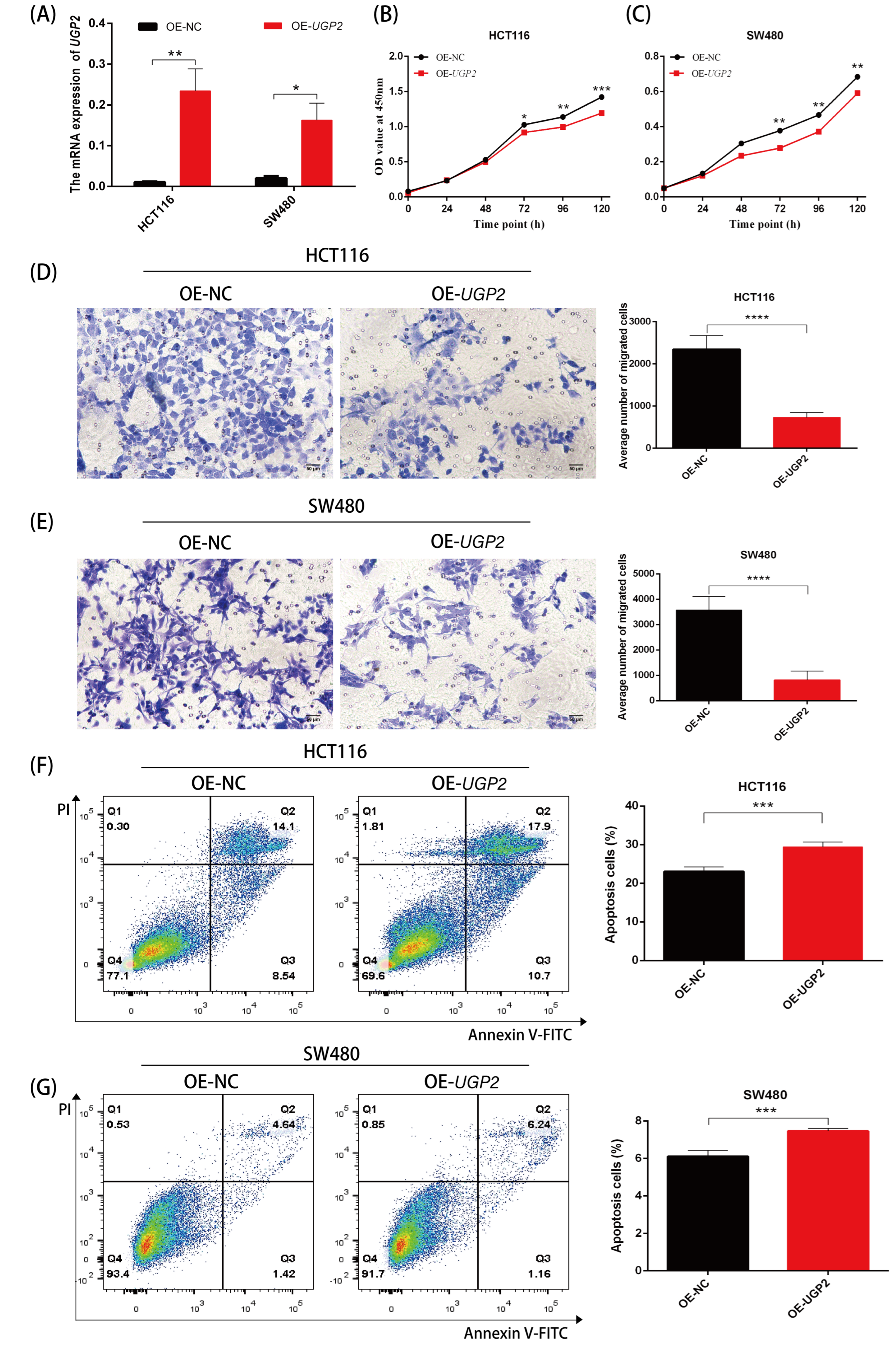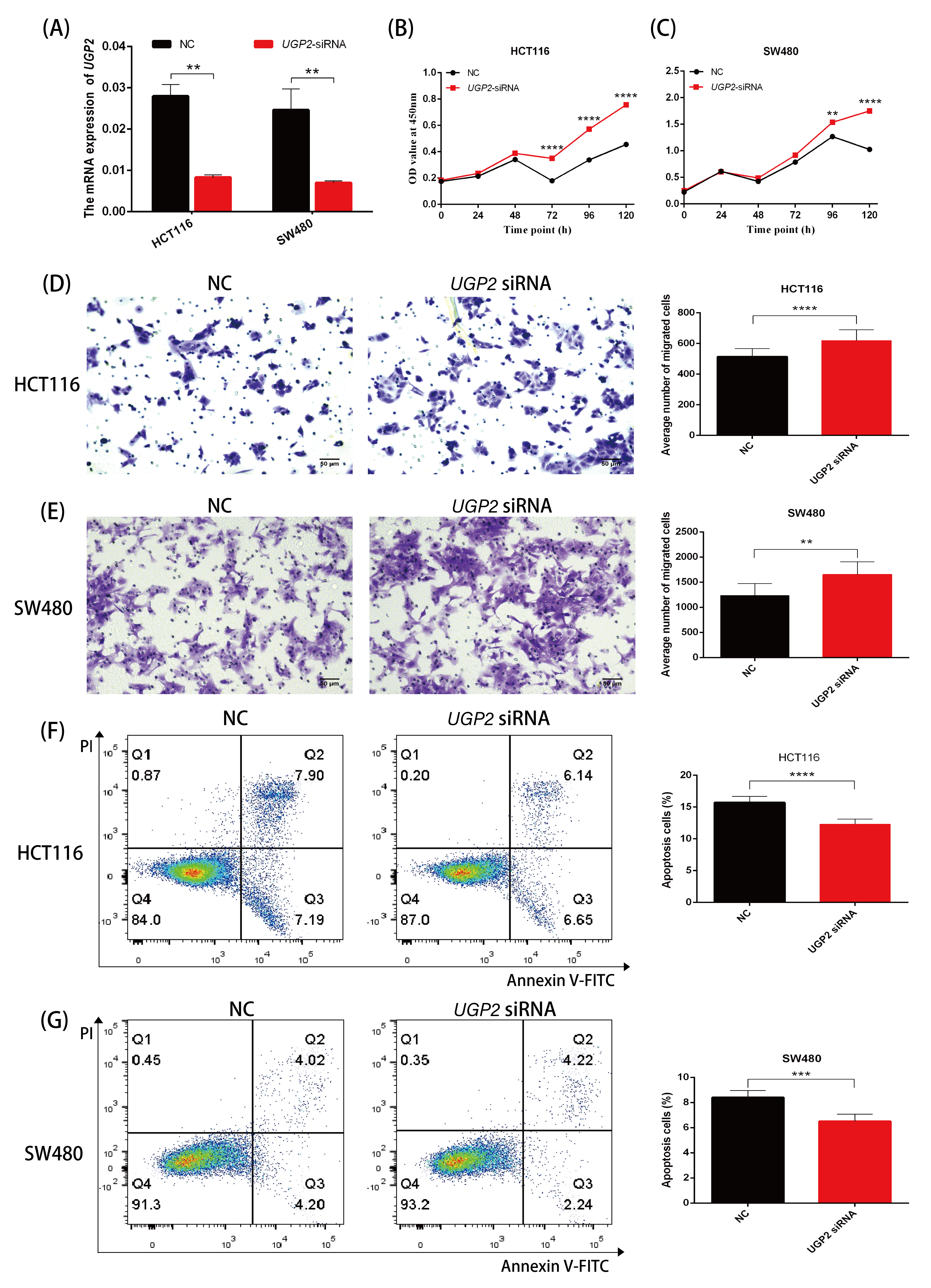 Suspensions of HCT-116 or SW480 cells were pre-cultured in 96-well plates for 24 h before being transfected with UGP2/NC siRNA or UGP2/NC OE. Cell proliferation was assessed 0, 24, 48, 72, 96, and 120 h after transfection using the Cell Counting Kit 8 (CCK-8; Dojindo, Kumamoto, Japan) per the manufacturer’s instructions. Absorbance at 450 nm was recorded as an indicator of cell viability. Cell migratory ability was assessed 24 h post-transfection using a migration chamber. Cells with weak migration ability on the upper surface of the chamber were carefully removed with a cotton swab, fixed with formalin, and stained with 0.1% crystal violet solution (Beyotime, Shanghai, China). Six random fields were examined for each insert under a microscope at ×100 magnification. Apoptosis was analyzed by flow cytometry using an Annexin V-FITC and propidium iodide (PI) detection kit (Beyotime, Shanghai, China). Cells were harvested 24 h or 48 h after transfection, stained according to the manufacturer’s protocol, and analyzed on a flow cytometer. The percentage of Annexin V-positive cells (early and late apoptotic populations) was quantified.