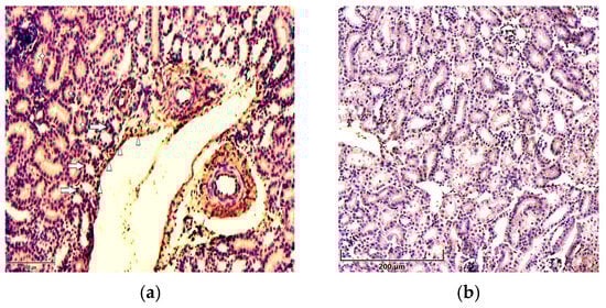 Immunolocalization of p21 in 7-day-old chickens: (a) the cytoplasm (asterisks) and nuclei (arrows) of renal tubular epithelial cells and vessels’ endothelial cells (arrowheads) show strong staining for p21 in the kidneys of chickens in the T-2 toxin group (n = 5). Scale bar: 100 µm. (b) Weak expression of p51 in the renal tissues of chickens in the control group (n = 5). Scale bar: 200 µm.