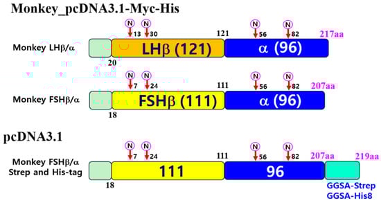 First, full-length fragments were cleaved using EcoRI and SalI restriction enzymes and ligated into the pcDNA3 expression vector. The constructs were inserted into the pcDNA3.1(−)/Myc-His vector using EcoRI and XbaI (or KpnI) restriction sites to incorporate Myc and His epitope tags without a stop codon. Subsequently, to efficiently detect and purify rec-monkey FSH, we introduced four amino acids (GGSA) and Strep- or His-tag sequences at the C-terminal region of the α-subunit (Figure 1). The modified genes were then subcloned into the pcDNA3.1 mammalian expression vector. The following expression constructs were generated: pcDNA3.1-M-LH β/α and pcDNA3.1-M-FSH β/α (for untagged versions), pcDNA3.1(-)/Myc-His-M-LH β/α and pcDNA3.1(-)/Myc-His-M-FSH β/α (for Myc-His-tagged versions), and pcDNA3.1-M-FSH β/α (for expression in CHO-S cells; GGSA-His and Strep-tag versions).