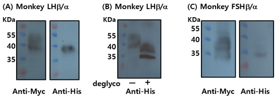 Western blot analysis of recombinant monkey LHβ/α and FSHβ/α proteins. Recombinant proteins were expressed in CHO-K1 cells. (A) LHβ/α proteins were separated by SDS-PAGE and detected using monoclonal anti-Myc and anti-His antibodies. (B) LHβ/α proteins were treated with PNGase F for 1 h at 37 °C, resulting in a mobility shift indicative of N-linked glycan removal. (C) FSHβ/α proteins were similarly analyzed by SDS-PAGE and detected using monoclonal anti-Myc and anti-His antibodies. “−” indicates untreated samples, and “+” indicates PNGase F-treated samples.