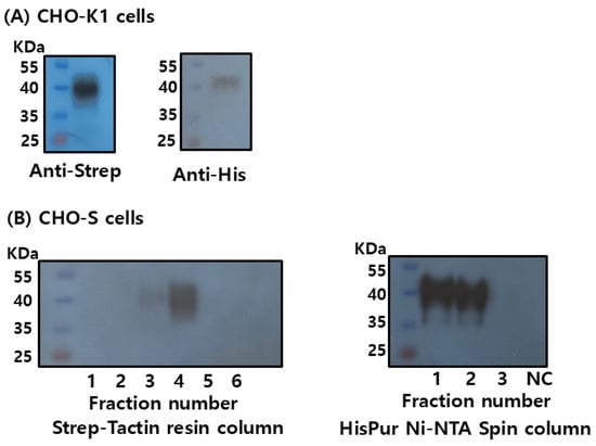 Following this initial culture, the cells were subcultured at a density of 5–6 × 105 cells/mL into 50–125 mL of fresh CHO expression medium in a disposable spinner flask and maintained under continuous agitation (120 rpm) to support suspension growth. On the day of transfection, the cell density reached approximately 1.2–1.5 × 106 cells/mL. For transfection complex formation, 160 µg of plasmid DNA and 160 µL of FreeStyle MAX reagent were diluted in 1.2 mL of OptiPRO serum-free medium, gently mixed, and incubated at room temperature for 5 min. The resulting transfection mixture (total volume: 2.4 mL) was added dropwise to the spinner culture to ensure even distribution. Culture supernatants were harvested on day 9 post-transfection and clarified by centrifugation at 500× g for 5 min. The collected media were concentrated using centrifugal filter units according to the manufacturer’s instructions. The expression of recombinant proteins was confirmed using Western blot analysis.