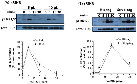 Next, pERK1/2 signaling was examined using purified recombinant monkey FSHβ/α produced in CHO-S cells and isolated via dual-affinity chromatography. HEK 293 cells transiently expressing either hFSHR or rFSHR were stimulated with 5 or 10 μL purified ligand. In hFSHR-expressing cells, rec-monkey FSHβ/α induced a rapid and robust increase in pERK1/2 phosphorylation that peaked at 5 min, followed by a sharp decline, indicating rapid desensitization of the signaling pathway (Figure 8A). In contrast, rFSHR-expressing cells exhibited a slower but more sustained activation pattern, with pERK1/2 levels peaking at 15 min and remaining at approximately 30–40% of the maximum value at 30 min post-stimulation (Figure 8B).
