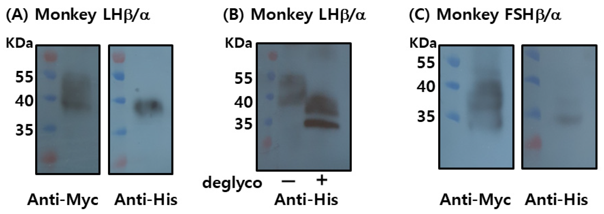 Recombinant LHβ/α (rec-LHβ/α) was successfully detected using both anti-Myc and anti-His monoclonal antibodies, confirming the expression and proper assembly of the tagged heterodimer. The apparent molecular mass of rec-LHβ/α was approximately 37–39 kDa, consistent with the predicted size, including post-translational modifications such as N-linked glycosylation. Treatment with peptide-N-glycosidase F (PNGase F) reduced the molecular mass to approximately 33–35 kDa (