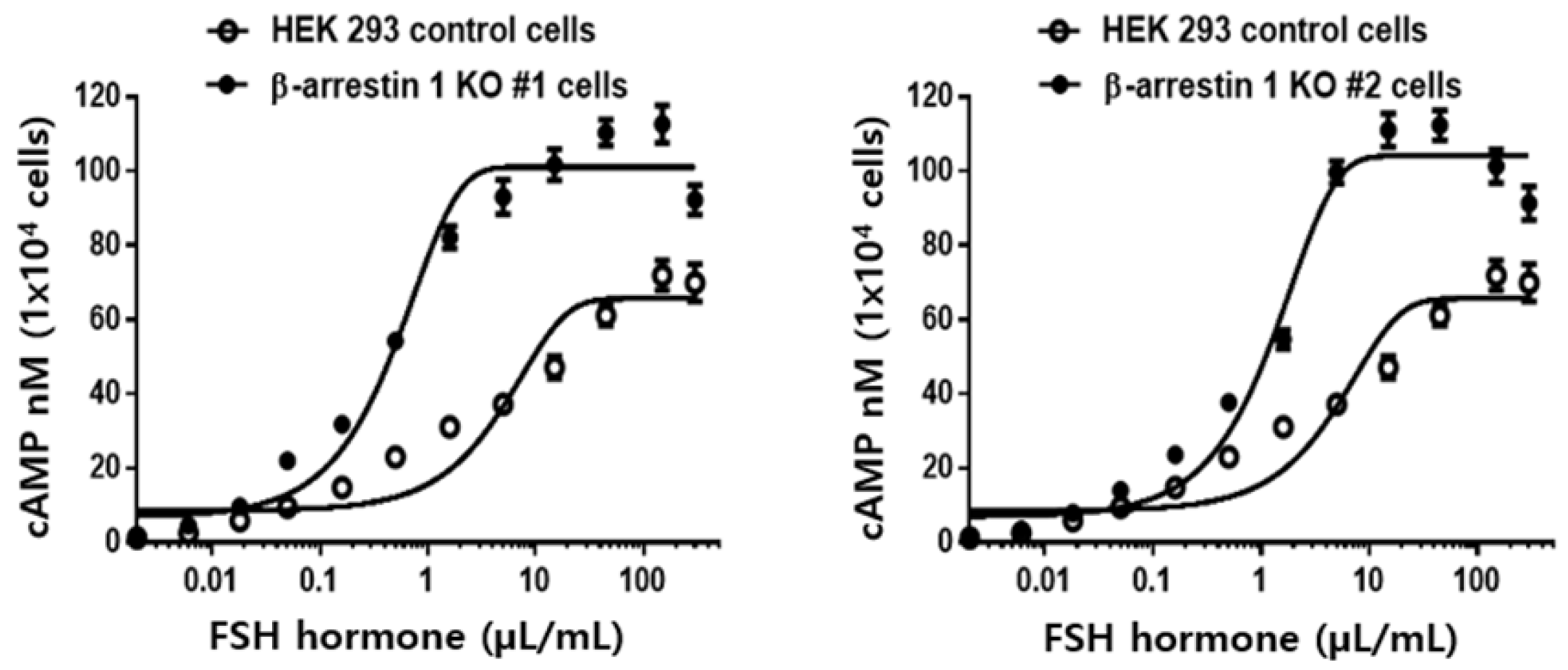 In this study, we observed that cAMP responses were significantly higher in β-arrestin 1 KO cells than in WT cells. A similar effect has been reported for the 5A-FSHR mutant, in which five C-terminal phosphorylation sites of the rat FSHR were substituted with alanine [
