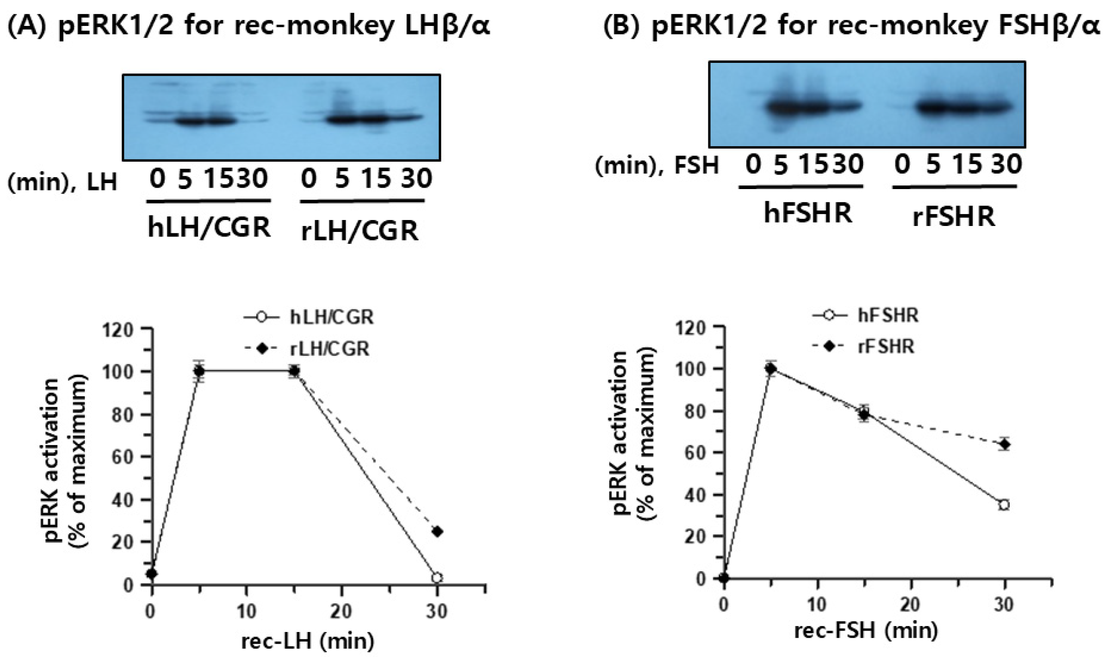 Figure 7A,B). Treatment with concentrated (10-fold) recombinant monkey gonadotropins produced in CHO-K1 cells led to rapid pERK1/2 activation at 5 min in both hLH/CGR- and rLH/CGR-expressing cells, and this activation was sustained for up to 15 min. Thereafter, pERK1/2 levels declined to nearly baseline in hLH/CGR-expressing cells, whereas approximately 25% of the activity was retained in rLH/CGR-expressing cells. A similar pattern was observed in hFSHR- and rFSHR-expressing cells, although the magnitude of activation was lower than that in LH/CGR-expressing cells. At 30 min, pERK1/2 activity was still detectable at approximately 35–64% depending on the receptor subtype.