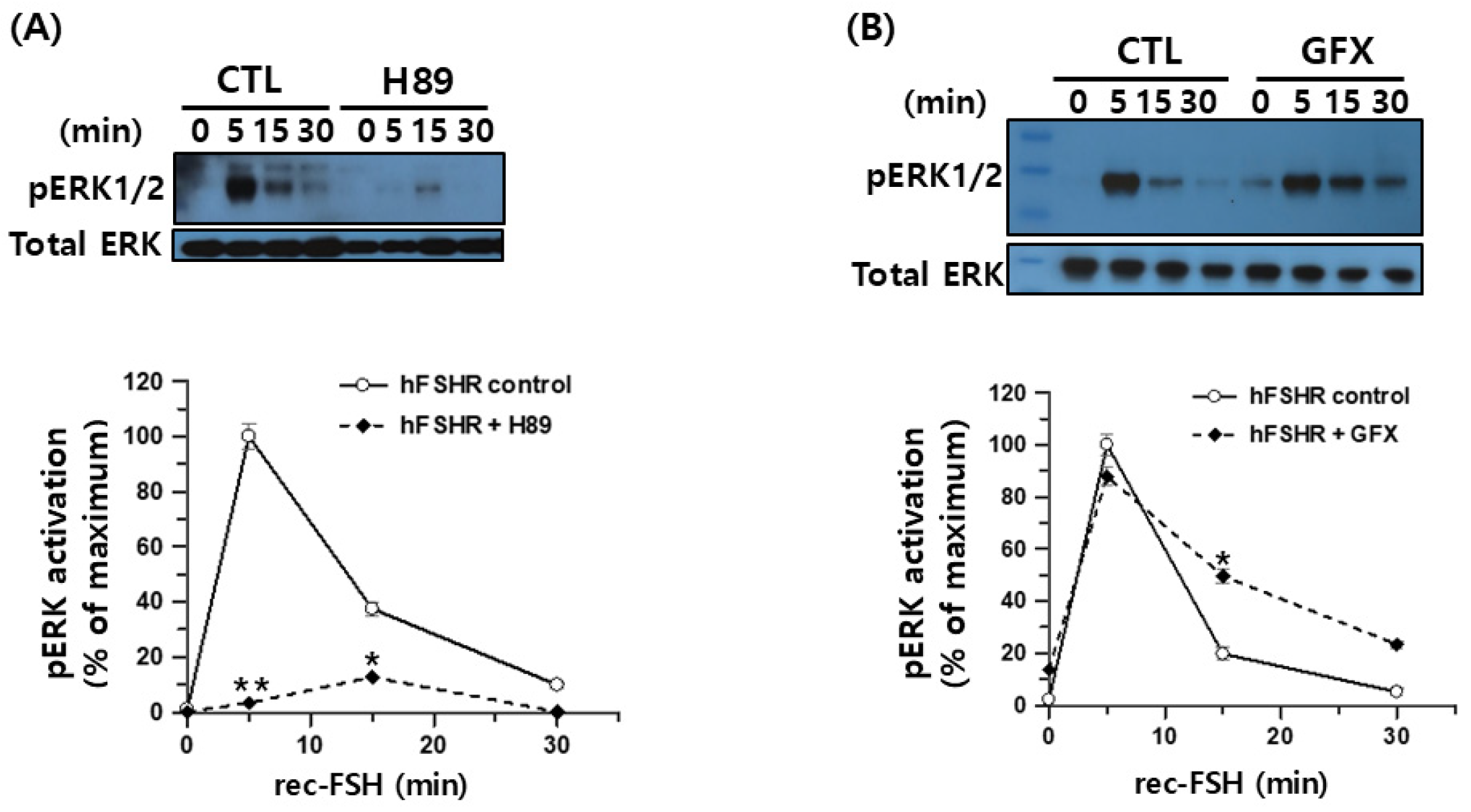 Figure 9A). Although a weak residual signal was detectable at 15 min, its magnitude was substantially reduced relative to that in the untreated controls. Thus, FSH-induced ERK1/2 activation via hFSHR is predominantly mediated through the canonical cAMP/PKA pathway.