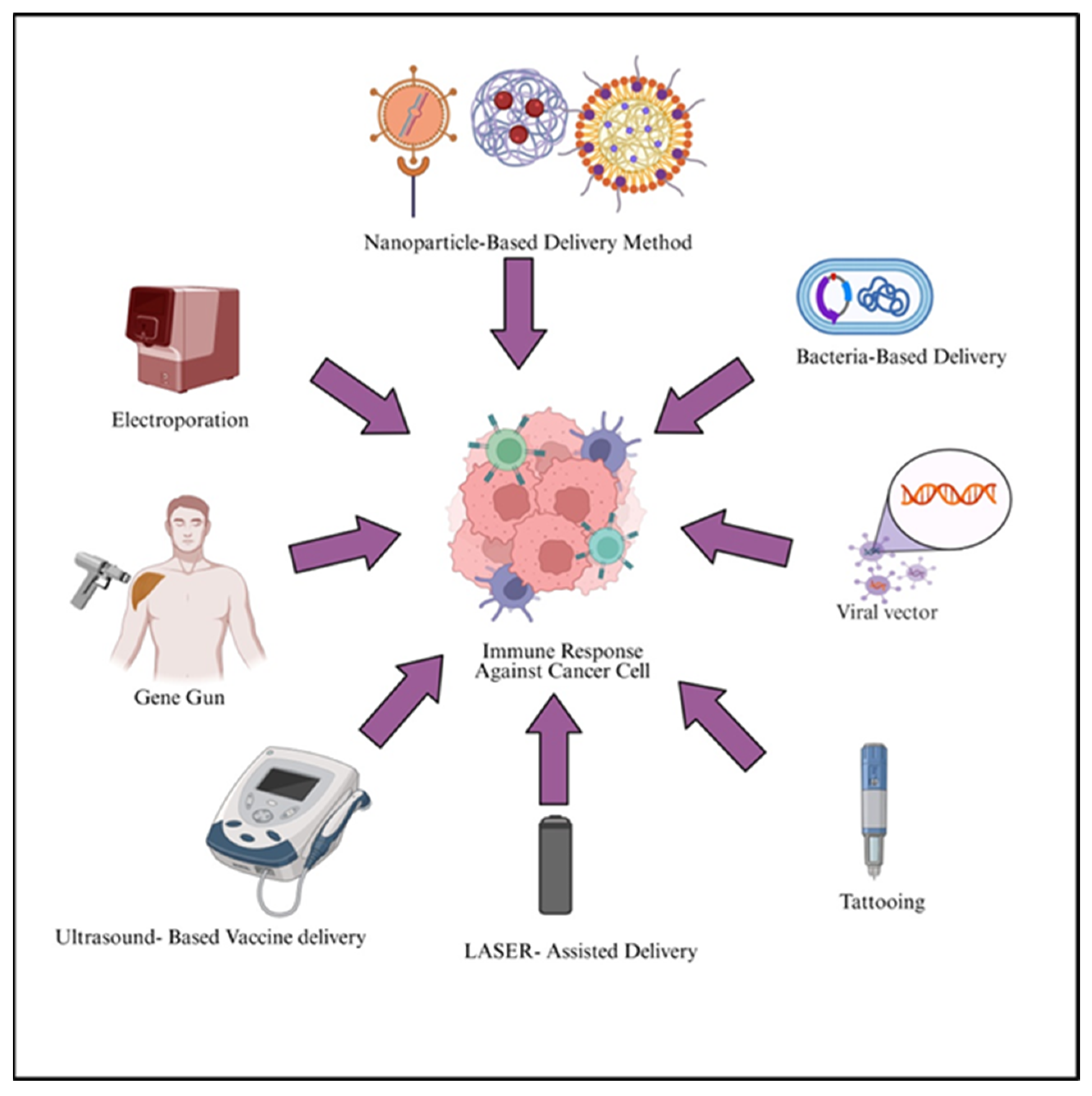 | Bacterial vectors mediated delivery | Attenuated bacteria invade APCs and deliver antigens genes/proteins | Listeria/salmonella engineered with tumor antigens administrated systemically or orally and stimulate innate and adaptive immunity | Tumor targeting, strong activation | Safety and toxicity issues | [163] |