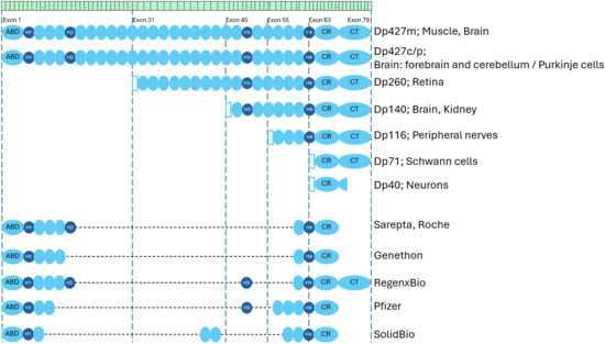 Isoforms of dystrophin and microdystrophins used in clinical trials. ABD—Actin-binding domain; CR—Cysteine-rich domain; CT—C-terminus domain; blue oval—Spectrin-like repeat; dark-blue circle—Hinge; green bar illustrates exons.