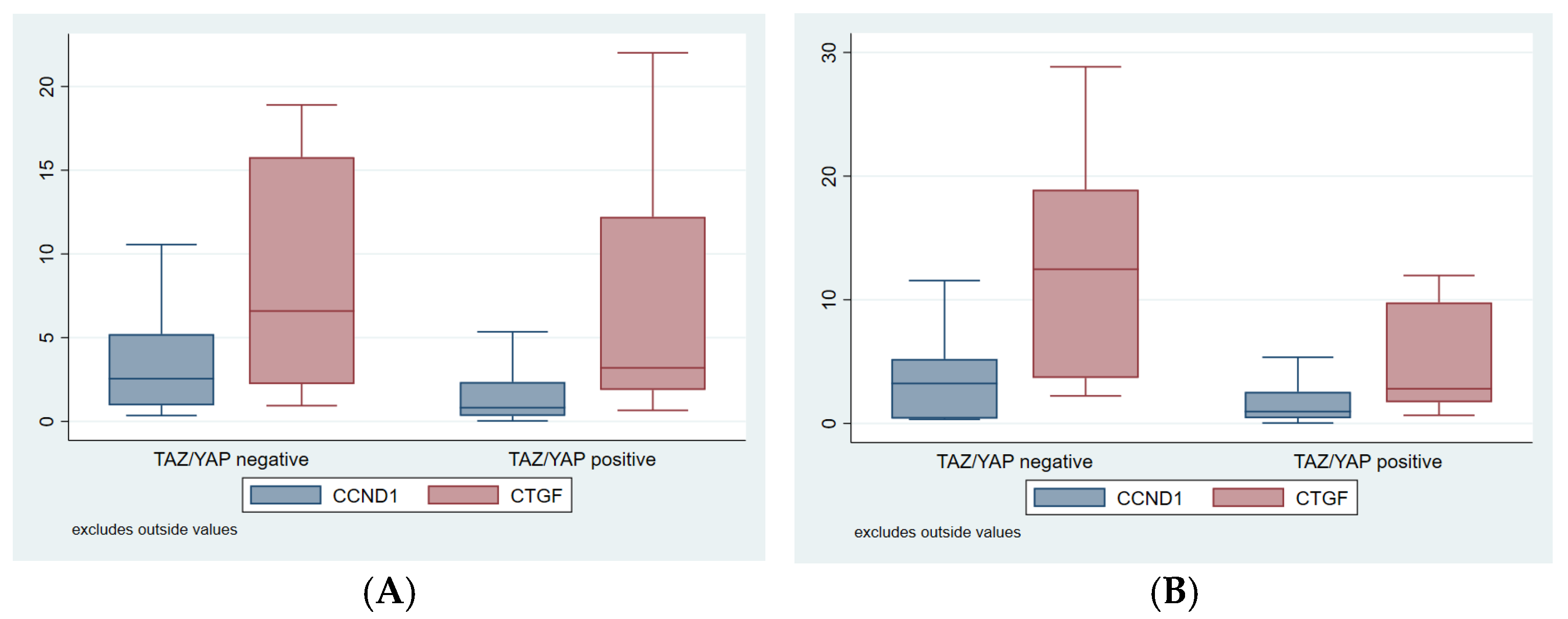 3.4. YAP, TAZ, CCND1, CTGF Gene Expression