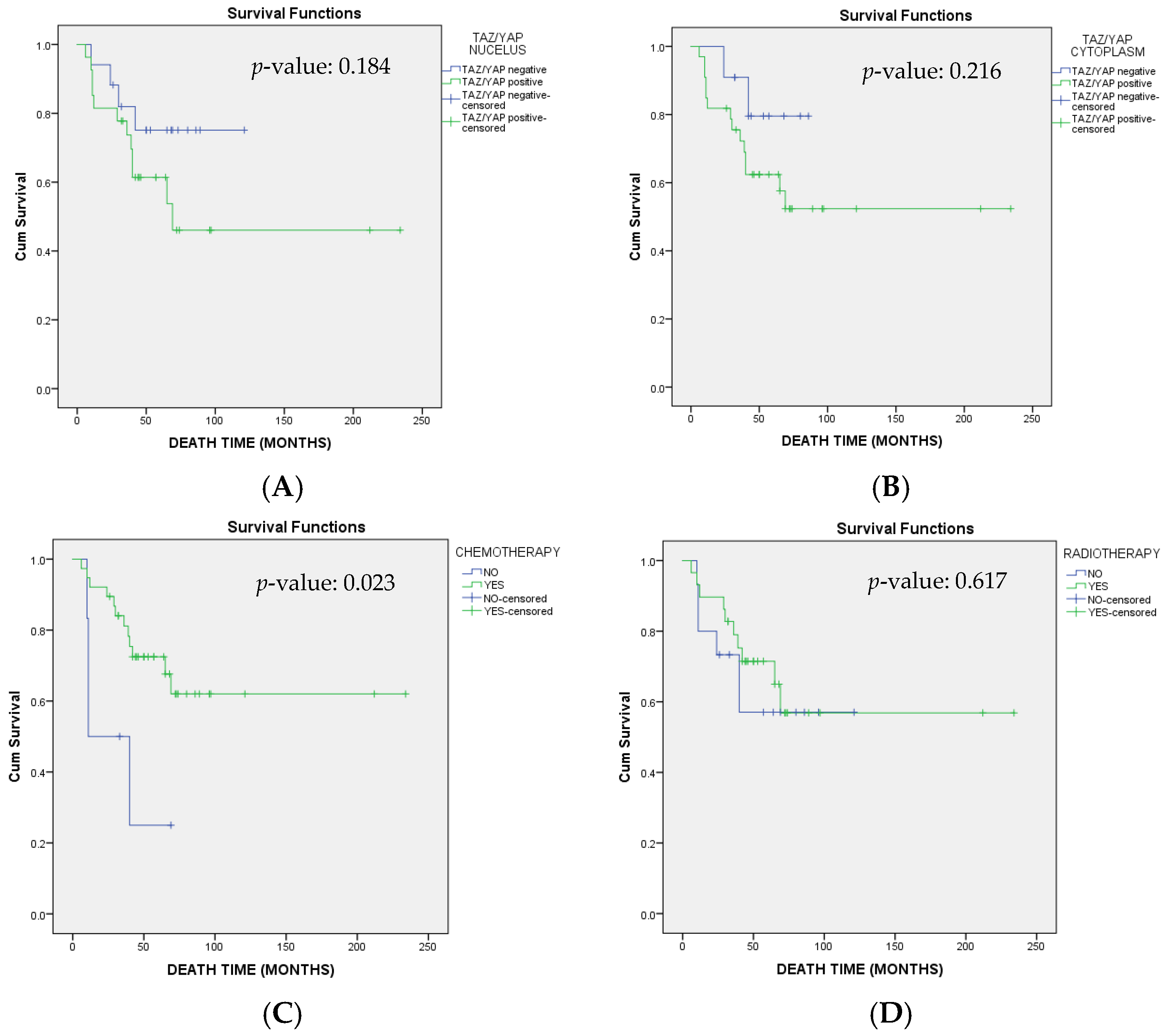 - Buglioni, S.; Vici, P.; Sergi, D.; Pizzuti, L.; Di Lauro, L.; Antoniani, B.; Sperati, F.; Terrenato, I.; Carosi, M.; Gamucci, T. Analysis of the hippo transducers TAZ and YAP in cervical cancer and its microenvironment. Oncoimmunology 2016, 5, e1160187. [Google Scholar] [CrossRef] [PubMed]