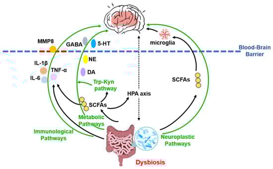 Building on the MGB axis, dysbiosis-induced systemic inflammation is a key mechanistic pathway linking the MGB axis to depression. An imbalanced gut microbiota can trigger the release of pro-inflammatory cytokines, which may cross the compromised blood–brain barrier and contribute directly to the development of depression symptoms [84]. A compelling mechanistic link involves matrix metalloproteinase-8 (MMP8), which is elevated in MDD patients and stress-vulnerable mice. MMP8 can traverse the blood–brain barrier, localize to reward-related regions such as the nucleus accumbens, and remodel the extracellular matrix, ultimately impairing social reward behavior [85,86]. This state of chronic inflammation is increasingly recognized as a central factor in depression pathophysiology, capable of damaging neuronal tissue and disrupting function [87].