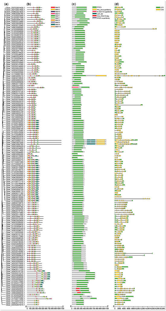 Gene structure and motif composition of PP2Cs in G. barbadense. (a) Phylogenetic grouping. The tree was constructed using MEGA 11 [21]. (b) Conserved motifs. On the right side, the top group of icons represent conserved motifs (motif 1–10) predicted by the MEME website. (c) PP2C domains. The middle group of icons denote six conserved PP2C protein related domains annotated using NCBI-CDD website. (d) Gene structure. The last two icons at the bottom represent gene structures, UTR and CDS. All above were visualized using TBtools [19].