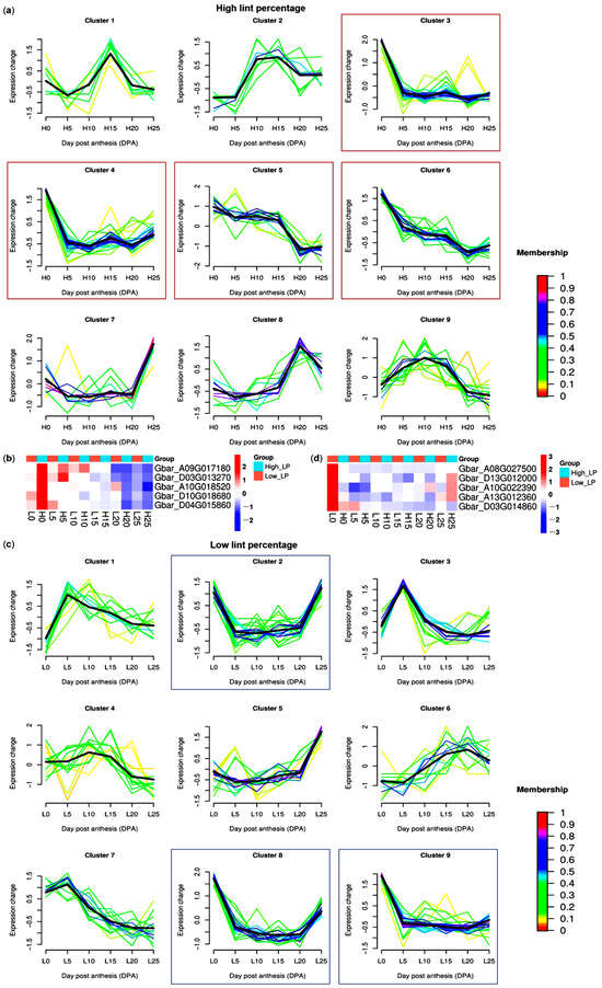 Fiber initiation stage (especially 0 DPA) is vital for lint formation. Here, we first performed mfuzz time series analysis of GbPP2C genes during different fiber development stages of high-lint-percentage G. barbadense accession. 96 GbPP2Cs highly expressed in 0 DPA were retrieved (clusters 3–6; Figure 7a). Among these, five genes (Gbar_A09G017180, Gbar_D03G013270, Gbar_A10G018520, Gbar_D10G018680, and Gbar_D04G015860) showed the highest expression and a fold change more than 2 at 0 DPA of high-lint-percentage genotype than low one (Figure 7b). Conversely, we obtained another five genes (Gbar_A08G027500, Gbar_D13G012000, Gbar_A10G022390, Gbar_A13G012360, and Gbar_D03G014860) with highest expression and more than 2 fold-change expression difference at 0 DPA of low lint-percentage (LP) accession (clusters 2, 8, 9; Figure 7c,d), suggesting roles as potential negative regulators of lint percentage. Notably, two genes (Gbar_D13G012000 and Gbar_A13G012360) were also identified as potential positive regulators of FW resistance, implying the negative correlation between yield and disease resistance.