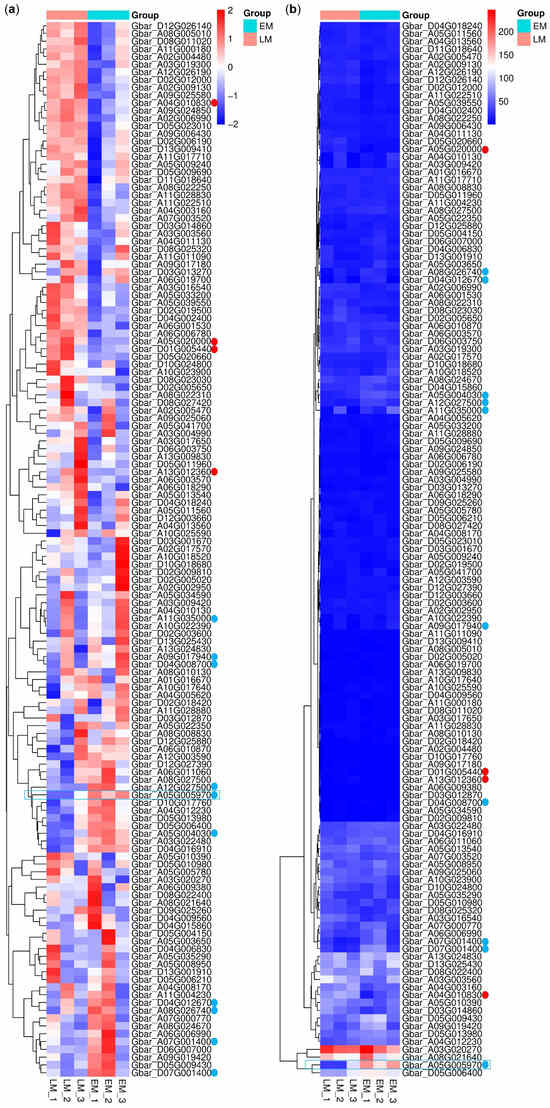 Expression profile of GbPP2C genes in LM and EM G. barbadense accessions. (a) Z-scored FPKM values. (b) Raw FPKM values. Dots, |log2(fold change)| > 1; blue, negative; red, positive. Blue box, the optimal negative candidate for maturity regulation of G. barbadense. Expression heatmaps were visualized using R software.