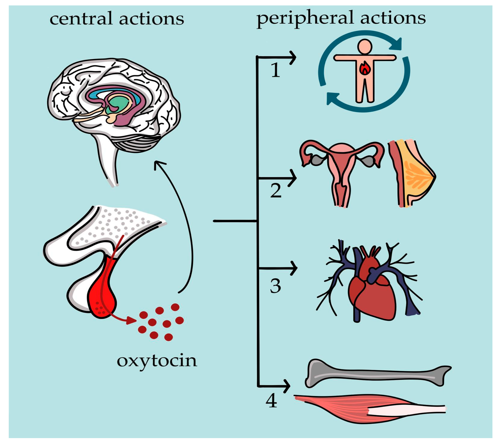 - Camerino, C. The Long Way of Oxytocin from the Uterus to the Heart in 70 Years from Its Discovery. Int. J. Mol. Sci. 2023, 24, 2556. [Google Scholar] [CrossRef]