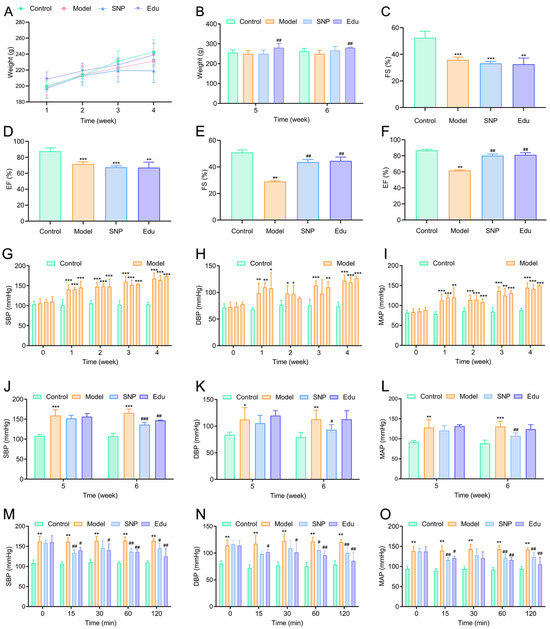 Effects of Edu on body weight, cardiac function, and blood pressure in hypertensive rats. (A,B) Changes in body weight over the first 4 weeks after treatment with SNP or Edu (A), and body weight at weeks 5 and 6 post-treatment (B). (C,D) Fractional shortening (FS) and left ventricular ejection fraction (EF) measured by non-invasive ultrasound before treatment. (E,F) FS and EF measured 2 weeks after treatment. (G–I) Changes in systolic blood pressure (SBP), diastolic blood pressure (DBP), and mean arterial pressure (MAP) before treatment. (J–L) Changes in SBP, DBP, and MAP 2 weeks after treatment. (M–O) Changes in SBP, DBP, and MAP at 15, 30, 45, 60, and 120 min after a single administration of SNP or Edu. Control (untreated), Model (L-NNA-induced hypertension), SNP (model rats administered with 1 mg/kg/day SNP), Edu (model rats administered with 6 mg/kg/day Edu). Data are presented as mean ± SD (n = 6). *, **, and *** indicated significantly different to Control group with p < 0.05, p < 0.01, and p < 0.001, respectively; #, ##, and ### indicated significantly different to Model group with p < 0.05, p < 0.01, and p < 0.001, respectively.