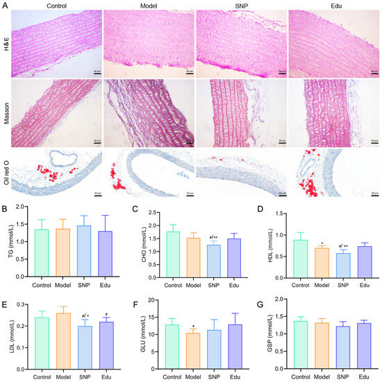 Improvement effects of Edu on biochemical indices and histopathology in rats. (A) Hematoxylin and eosin (H&E) staining, Masson’s trichrome staining, and Oil Red O staining of the thoracic aorta from each group of rats after two weeks of treatment with SNP or Edu. (B–G) Serum levels of triglycerides (TG), cholesterol (CHO), high-density lipoprotein cholesterol (HDL), low-density lipoprotein cholesterol (LDL), glucose (GLU), and glycated serum protein (GSP) measured using an automatic biochemical analyzer (AU5810, Bechman, CA, USA) after two weeks of treatment with SNP or Edu. Control (untreated), Model (L-NNA-induced hypertension), SNP (model rats administered with 1 mg/kg/day SNP), Edu (model rats administered with 6 mg/kg/day Edu). Data are expressed as mean ± SD (n = 6). * and ** indicated significantly different to Control group with p < 0.05 and p < 0.01, respectively; # indicated significantly different to Model group with p < 0.05.