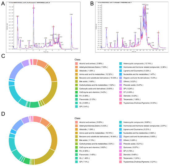 Mass spectrometry total ion current (TIC) overlap and metabolite classification of quality control (QC) samples. (A) Overlaid TIC of QC samples in negative ion mode. (B) Overlaid TIC of QC samples in positive ion mode. (C) Ring chart of metabolite category composition in the Model group. (D) Ring chart of metabolite category composition in the Edu group. Model (L-NNA-induced hypertension), Edu (model rats administered with 6 mg/kg/day Edu).