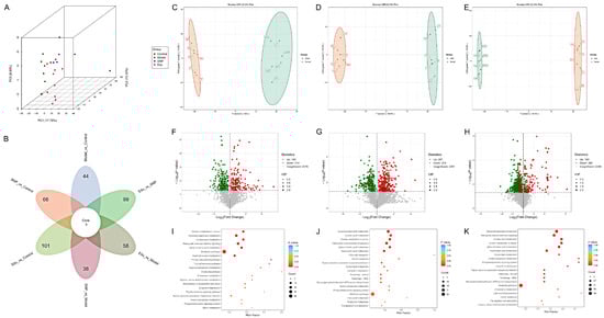 A 50 μL aliquot of abdominal aorta serum from each group of rats was mixed with 300 μL of a 20% acetonitrile-methanol internal standard extraction solution. The mixture was vortex-mixed for 3 min and centrifuged at 4 °C and 12,000 rpm for 10 min. Subsequently, 200 μL of the supernatant was collected and placed in a −20 °C freezer for 30 min. This was followed by another centrifugation step under the same conditions (4 °C, 12,000 rpm) for 3 min, after which 180 μL of the supernatant was taken for instrumental analysis. Chromatographic separation was performed using a Waters ACQUITY Premier HSS T3 column (1.8 μm, 2.1 mm × 100 mm). Mobile phase A was a 0.1% formic acid aqueous solution, and mobile phase B was a 0.1% formic acid acetonitrile solution. The column temperature was set at 40 °C, the flow rate was 0.4 mL/min, and the injection volume was 4 μL. The raw mass spectrometry data were converted to mzXML format and preprocessed using XCMS software (v. 3.7.1) for peak extraction, alignment, retention time correction, filtering, filling, and recalibration. Compound identification was subsequently conducted, screening for substances with a composite score above 0.5 and a quality control (QC) sample coefficient of variation (CV) less than 0.3. Data from positive and negative ion modes were then merged (prioritizing substances with the highest identification level and the smallest CV value) to obtain the relevant analysis files.