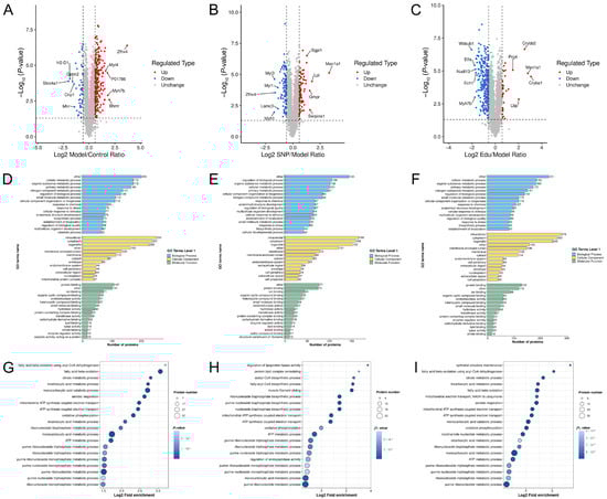 To examine changes in differential proteins, criteria were set at a p-value < 0.05 and |FC| ≥ 1.5. The results demonstrated that compared to the normal Control group, the Model group exhibited significant alterations in 292 proteins, with 245 proteins up-regulated and 47 down-regulated. Compared to the Model group, the Edu treatment group showed significant changes in 320 proteins, including 285 down-regulated and 35 up-regulated. In contrast, the SNP positive Control group displayed significant alterations in 188 proteins, with 86 up-regulated and 102 down-regulated (Figure 5A–C).