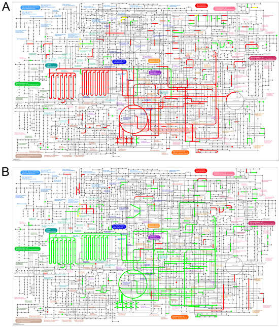 Proteomics and metabolomic correlation analysis. (A) The iPath pathway of differential metabolites and differential genes in the Model group and Control group (B) The iPath pathway of differential metabolites and differential genes in the Edu group and Model group. Nodes represent biochemical molecules, and lines represent biochemical reactions. Different colors in the pathway indicate the differential expression of proteins and metabolites. Red indicates up-regulation, green indicates down-regulation, and yellow indicates both up-regulation and down-regulation. Control (untreated), Model (L-NNA-induced hypertension), Edu (model rats administered with 6 mg/kg/day Edu).