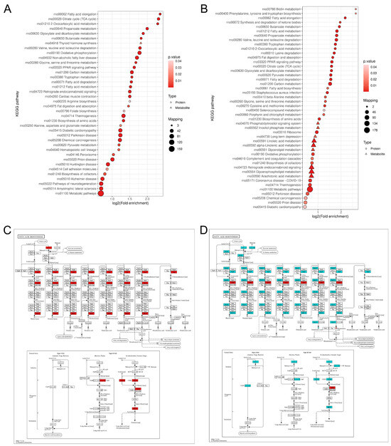 We employed Fisher’s exact test to perform KEGG pathway enrichment analysis on both differentially expressed proteins and metabolites, with a significance threshold set at p < 0.05 for identifying significantly enriched pathways. The enrichment results are visualized in the corresponding figures, where the horizontal axis represents the log2-transformed enrichment factor, and the vertical axis displays the descriptions of the KEGG pathways. Triangles denote metabolites, while circles represent proteins. The color of the points indicates the significance of enrichment, with red indicating stronger enrichment significance. The size of the points corresponds to the number of metabolites or proteins involved in the pathway. The results demonstrated that in the comparison between the Model and Control groups, fatty acid metabolism-related pathways (such as fatty acid elongation, fatty acid biosynthesis, and fatty acid degradation) were significantly enriched, with multiple metabolism-related entries ranking among the top five most significant pathways in the metabolic network. In the comparison between the Edu and Model groups, fatty acid metabolism exhibited a high enrichment factor (Figure 8A,B). These findings suggest that fatty acid metabolism is one of the primary metabolic pathways involved in both the pathological state of hypertension and the response to Edu intervention.