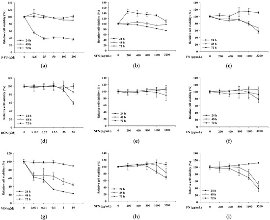 After 72 h of treatment, the anticancer effects of 5-FU (Figure 1a), NFN (Figure 1b), and FN (Figure 1c) were evaluated using the XTT assay. In A549 cells, 5-FU, NFN, and FN significantly reduced cell viability in a dose-dependent manner. Similarly, DOX (Figure 1d), NFN (Figure 1e), and FN (Figure 1f) decreased MCF-7 cell viability in a dose-dependent manner. In SH-SY5Y cells, VIN (Figure 1g), NFN (Figure 1h), and FN (Figure 1i) exhibited dose-dependent anticancer effects.