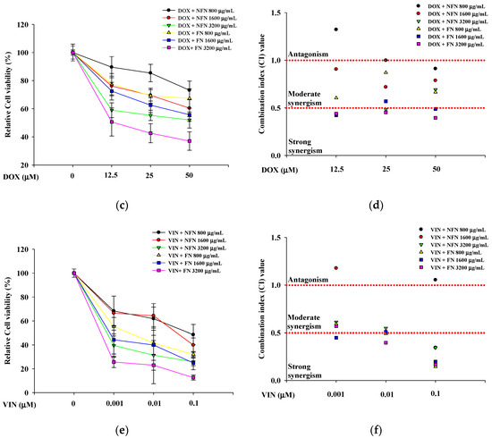 A549, MCF-7, and SH-SY5Y cells were seeded in 96-well plates at a density of 1 × 104 cells/well and incubated for 24 h, to allow cell adherence. A549 cells were treated with 5-FU (12.5 to 200 μM), NFN (200 to 3200 μg/mL), FN (200 to 3200 μg/mL), and a combination of 5-FU and NFN or FN (5-FU/NFN or FN) at various concentration combinations (i.e., 12.5/800, 12.5/1600, 12.5/3200, 25/800, 25/1600, 25/3200, 50/800, 50/1600, and 50 μM/3200 μg/mL). MCF-7 cells were treated with DOX (3.125 to 50 μM), NFN (200 to 3200 μg/mL), FN (200 to 3200 μg/mL), and a combination of DOX and NFN or FN (DOX/NFN or FN) at various concentration combinations (i.e., 12.5/800, 12.5/1600, 12.5/3200, 25/800, 25/1600, 25/3200, 50/800, 50/1600, and 50 μM/3200 μg/mL). SH-SY5Y cells were treated with VIN (0.001 to 10 μM), NFN (200 to 3200 μg/mL), FN (200 to 3200 μg/mL), and a combination of VIN and NFN or FN (VIN/NFN or FN) at various concentration combinations (i.e., 0.001/800, 0.001/1600, 0.001/3200, 0.01/800, 0.01/1600, 0.01/3200, 0.1/800, 0.1/1600, and 0.1 μM/3200 μg/mL). Untreated cells (no drug and no NFN or FN treatment) were used as the control group for all experiments. After 24, 48, and 72 h of incubation, cell viability was assessed using the XTT assay, following standard procedures. The CompuSyn computer program (www.combosyn.com (accessed on 5 December 2024)) was used to quantify the synergism of 5-FU, DOX, VIN, and FN or NFN combinations using the Chou-Talalay method [17]. The synergism of 5-FU, DOX, VIN, and FN or NFN co-treatment was evaluated by calculating the combination index (CI) value, wherein CI < 0.5 indicated strong synergism, 0.5< CI < 1.0 indicated moderate synergism, and 1.0 < CI indicated antagonism [18].