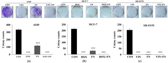 A modified method was used to assess early colony formation [19]. A549, MCF-7, and SH-SY5Y cells were seeded in 6-well plates at a density of 1 × 103 cells/well and incubated for 24 h to allow cell attachment. A549 cells were treated with 5-FU (50 µM), FN (3200 µg/mL), and 5-FU (50 µM) combined with FN (3200 µg/mL). MCF-7 cells were treated with DOX (50 µM), FN (3200 µg/mL), and DOX (50 µM) combined with FN (3200 µg/mL); SH-SY5Y cells were treated with VIN (0.1 µM), FN (3200 µg/mL), and VIN (0.1 µM) combined with FN (3200 µg/mL). Every 3 d, the complete culture medium containing the anticancer drugs, FN, or a combination of anticancer drugs and FN was replaced, and the cells were cultured for 10 d. After incubation, the cells were washed thrice with PBS, fixed with 4% formaldehyde for 15 min, and stained with 5% crystal violet for 30 min. The stained cells were air-dried, and the number of colonies was quantified using the ImageJ software.