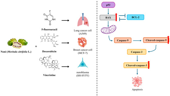 Schematic summary of the synergistic anticancer effect mechanism of fermented noni extract combined with 5-fluorouracil, doxorubicin, or vincristine via the intrinsic apoptotic pathway. The combination treatment enhances p53-mediated BAX activation, inhibits BCL-2, and promotes caspase-9 and caspase-3 cleavage, ultimately inducing apoptosis in A549, MCF-7, and SH-SY5Y cells.