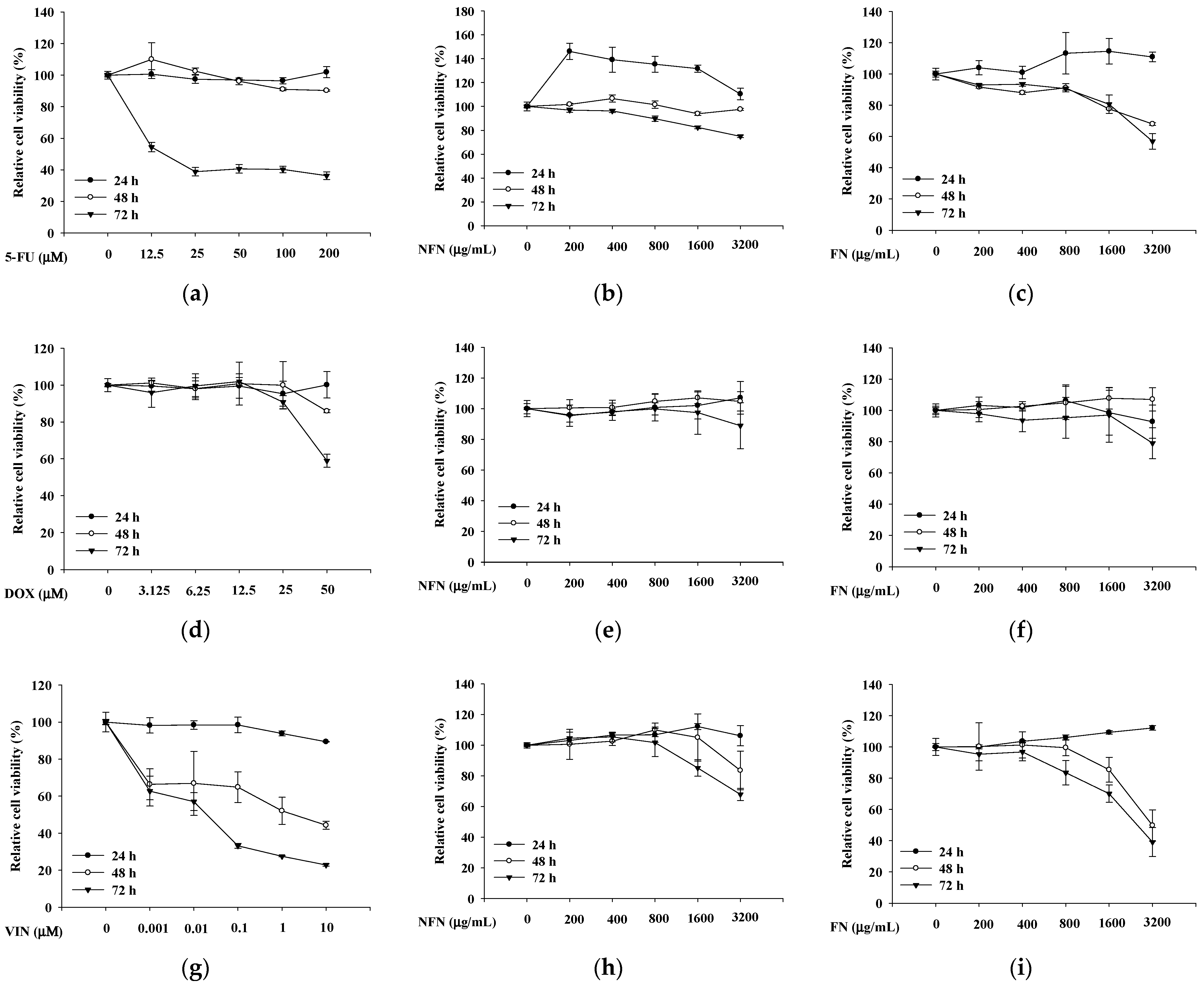 3.1.1. Anticancer Effects of 5-FU, DOX, VIN, NFN, and FN in A549, MCF-7, and SH-SY5Y Cells