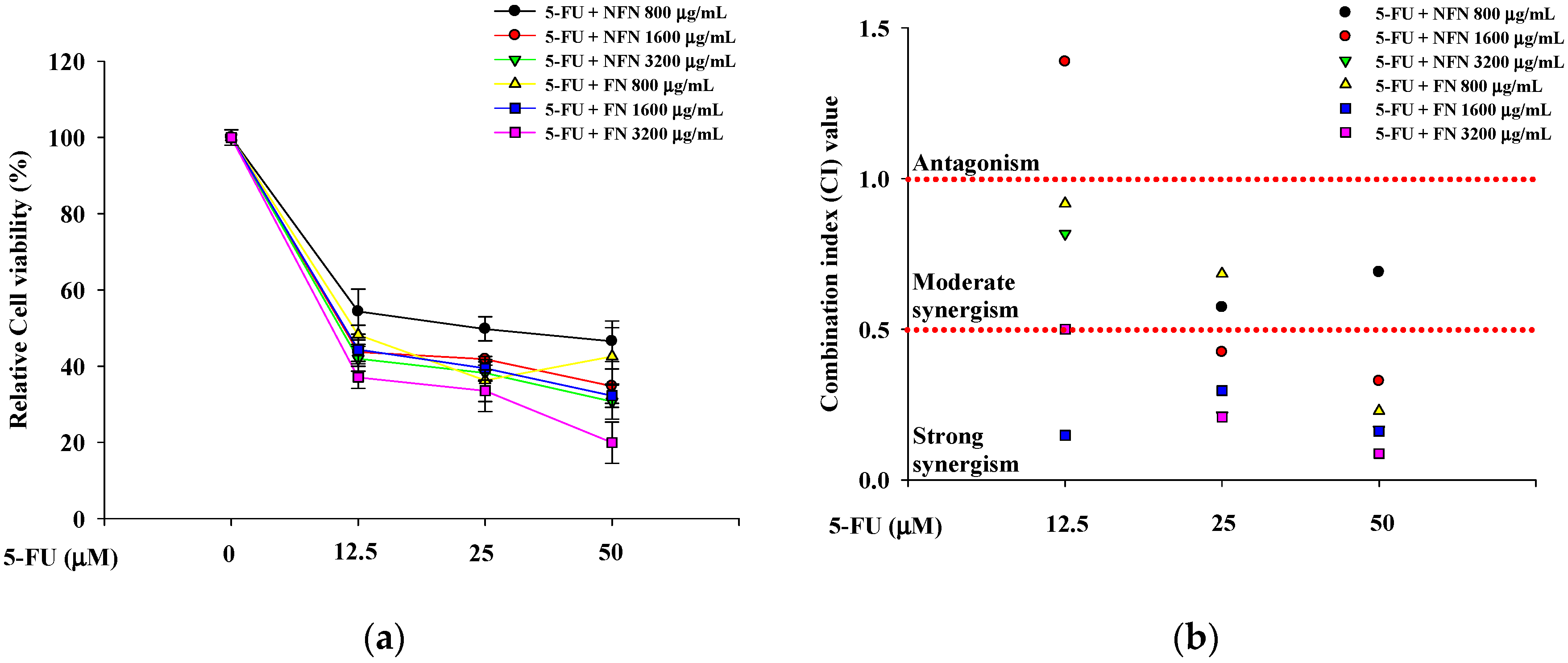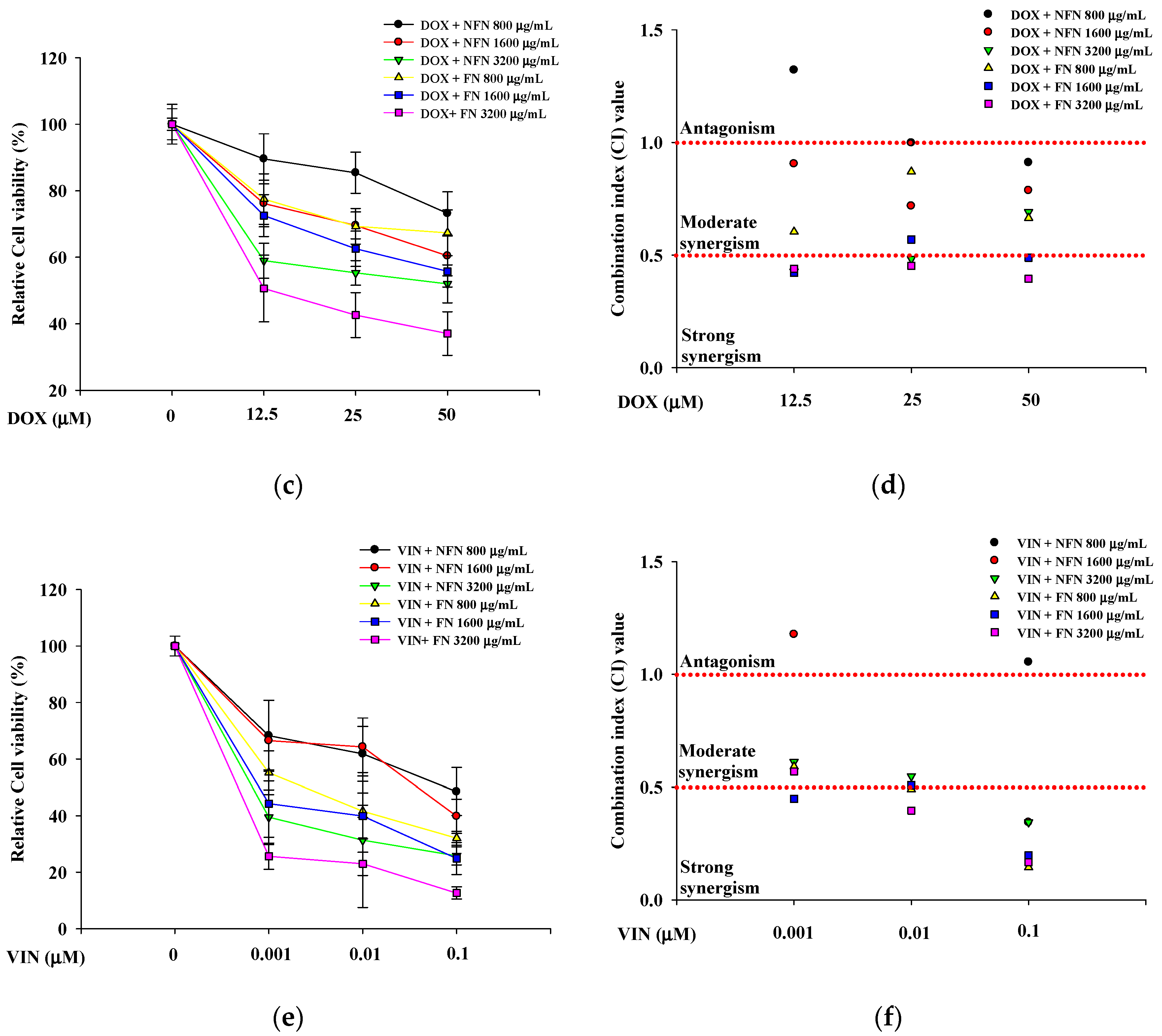 3.1.2. Synergistic Anticancer Effects of 5-FU, DOX, and VIN Combined with NFN or FN in A549, MCF-7, and SH-SY5Y Cells