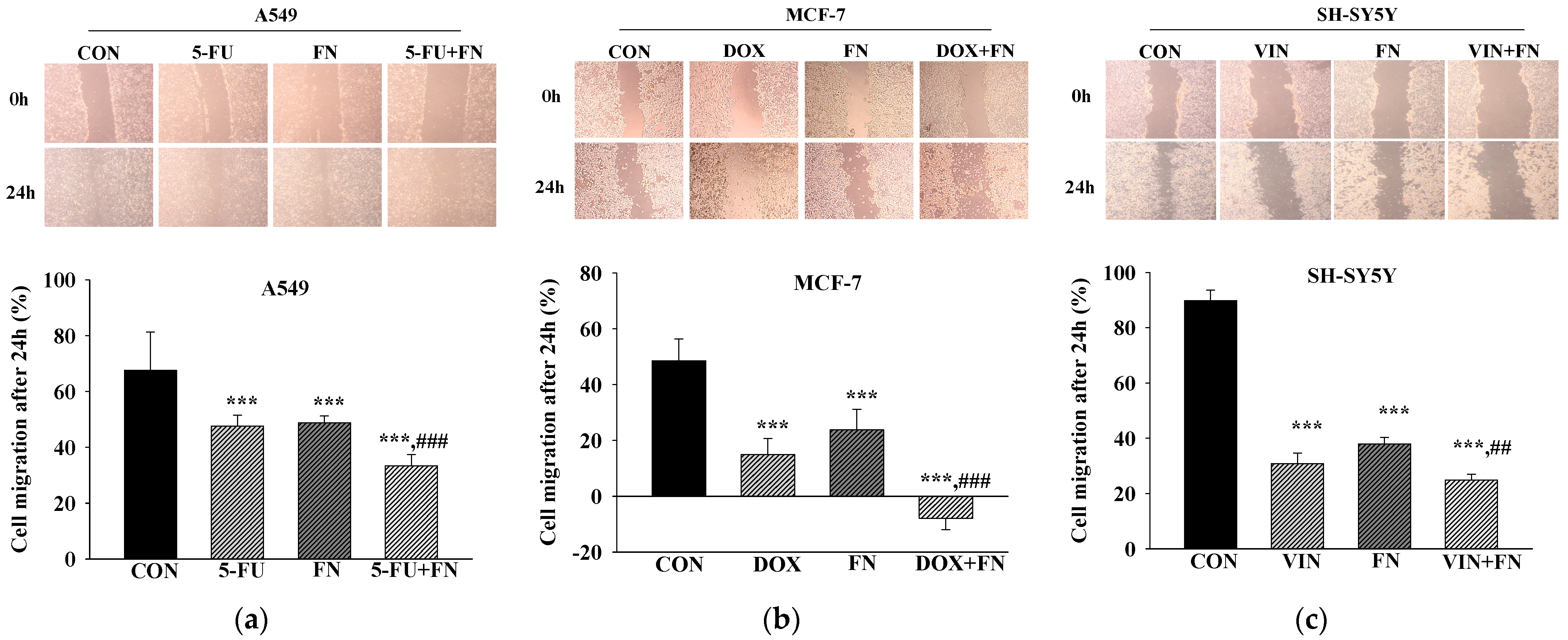 3.2. Effects of 5-FU, DOX, and VIN Combined with NFN or FN on Cell Migration in A549, MCF-7, and SH-SY5Y Cells