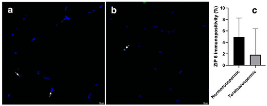 Normozoospermic samples had a mean value 4.94 ± 3.29% ZIP6 immunopositivity in the head of spermatozoa, while teratozoospermic samples had a mean 1.85 ± 4.53% ZIP6 immunopositivity in the head of spermatozoa (Figure 1c).