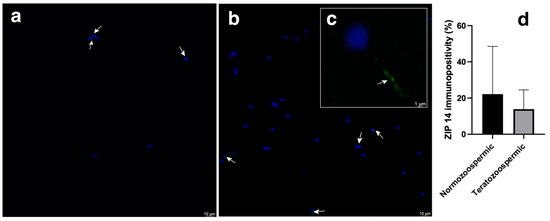 Normozoospermic samples had a mean 22.1 ± 26.3% of ZIP14 immunopositivity in the head of spermatozoa, whereas teratozoospermic samples had a mean 13.8 ± 10.6% ZIP14 immunopositivity in the head of spermatozoa (Figure 2d). However, comparison of ZIP14 immunopositivity between normozoospermic and teratozoospermic men did not reveal a statistically significant difference.