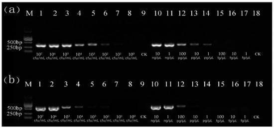 3.2. Comparison of the Amplification and Sensitivity of Specific Primers