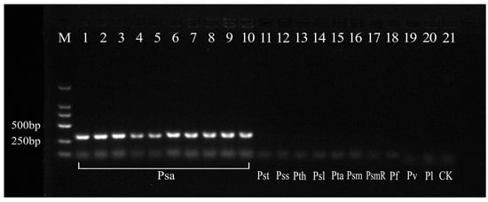 Specificity detection of the PsaF/R primer. Lanes 1–10: Psa strains. Lanes 11–20: Pst for P. s. pv. tomato, Pss for P. s. pv. syringae, Pth for P. s. pv. theae, Psl for P. s. pv. lachrymans, Pta for P. s. pv. tabaci, Psm for P. s. pv. mori, PsmR for P. s. pv. morsprunorum, Pf for P. fluorescens, Pv for P. viridiflava, and Pl for P. lurida. Lane 21: a negative control of sterile water (CK). M: DL2000 marker.