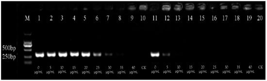 The concentration of PMA used in this study was determined by detecting Psa at a concentration of 107 cfu/mL (Figure 3). The findings indicated that, as the concentration of PMA increased, more PMA bound to the DNA of heat-killed bacterial cells, leading to a gradual weakening and eventual disappearance of the brightness of the target fragment. Specifically, when the concentration of PMA exceeded 10 μg/mL, the brightness of the target fragment began to diminish significantly, suggesting that PCR amplification for heat-lethal bacterial cells was completely inhibited. Consequently, it was established that the maximum PMA concentration required for the complete inhibition of PCR amplification for heat-lethal bacterial cells is 10 μg/mL.