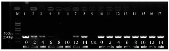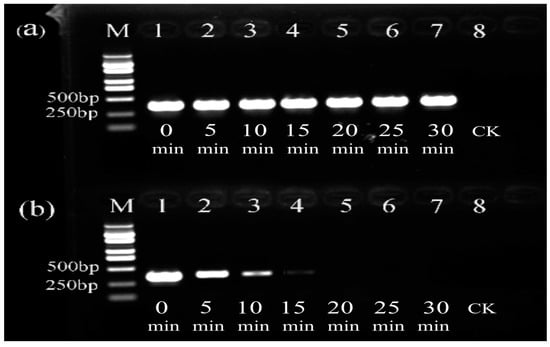 The bacterial suspension with PMA was exposed for different times (Figure 5). The brightness of the target fragment of the live bacteria did not change over time (Figure 5a). In contrast, as the exposure time increased, the brightness of the target fragment of heat-killed bacteria decreased gradually (Figure 5b). At 20 min or longer, the target fragment completely disappeared. The results indicated that the optimal exposure time for the PMA–PCR detection of heat-killed Psa bacterial cells was 20 min, which fully suppressed the PCR amplification of dead bacteria while having no impact on live ones.