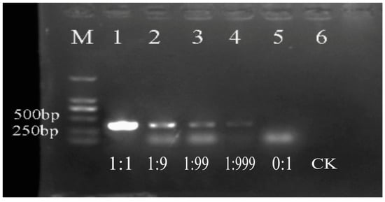 In mixed samples of heat-lethal and live bacterial cells with different proportions, the detection results of the live bacteria can be seen in Figure 6. We found that live bacterial cells in the mixed samples with different proportions of dead cells were all positive. As the proportion of dead bacteria increased, the target fragments darken. The target disappeared when the percentage of dead bacterial cells accounted for 100%. It showed that the PMA–PCR assay could be used to detect the viable bacteria in a mixed cell suspension with dead bacteria.