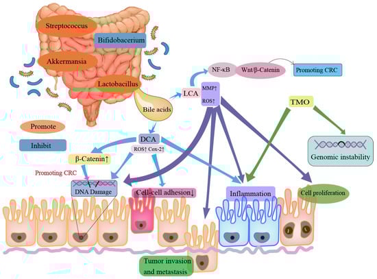 | Proteobacteria | Escherichia coli | Regulate immunity | Promote | Inflammatory reactions [65] DNA damage Secrete virulence factors to activate COX-2 Promote cell-cycle arrest [66] Induce CRC cells apoptosis [66] Disrupt the intestinal vascular barrier |