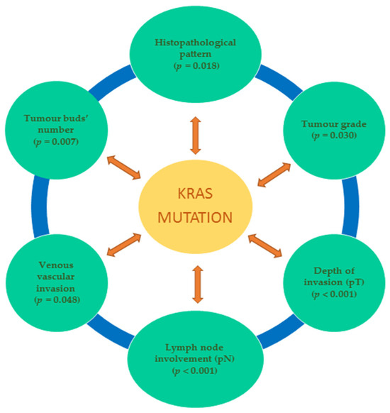 The frequency of KRAS mutation in our study group complies with the literature data. A comparative statistical analysis revealed significant associations between KRAS mutation and some clinicopathological features, such as tumour histological pattern (p = 0.018), tumour grade (p = 0.030) depth of invasion (pT) (p < 0.001), lymph node involvement (pN) (p < 0.001), and tumour budding (p = 0.007). Additionally, OR calculation showed that KRAS mutation showed a strong association with cribriform tumour histology, N2 lymph node involvement (pN), venous invasion, and a high number of tumour buds (between 7 and 12). Considering that these clinicopathological features are associated with an unfavourable prognosis, our results may suggest that the detection of KRAS mutation may be an indicator of unfavourable outcome, a finding which is consistent with the results of other studies [6,51]. However, our findings need to be validated in more extensive study groups.