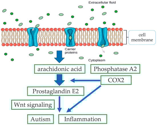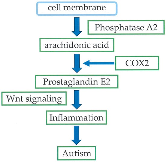 The presence of an abnormal COX-PGE2 signaling pathway due to genetic or environmental causes may be linked to ASD [23]. The brain at embryonic day 16 (E16) is particularly susceptible to the influence of biological pathways involving various ASD-associated genes. Crosstalk between the COX2–PGE2 and Wnt pathways during early brain development may play a crucial role in the pathophysiology of ASD models [23].