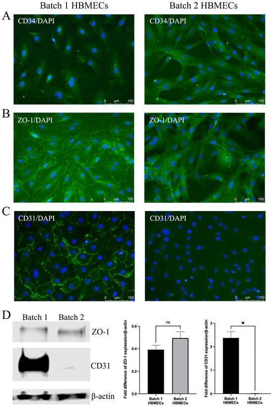 Contrary to HBMECs with cobblestone morphology, HBMECs with elongated morphology displayed strong CD34 staining in the cytoplasm. CD34 is regarded as an important marker of hematopoietic stem/progenitor cells and vascular endothelial progenitor cells (Figure 2A). In contrast, HBMECs with cobblestone morphology manifested a typical ZO-1 plasma membrane staining, which appeared to localize to the cytoplasm in elongated HBMECs (Figure 2B). Similar to ZO-1, batch 1 HBMECs also showed a prominent staining of CD31 on plasma membrane. However, no CD31 staining could be detected in batch 2 HBMECs (Figure 2C). Western analyses of total protein samples obtained from batch 1 and batch 2 cells substantiated the significantly depleted presence of CD31 in batch 2 cells and ZO-1 level remained similar between batches (Figure 2D).